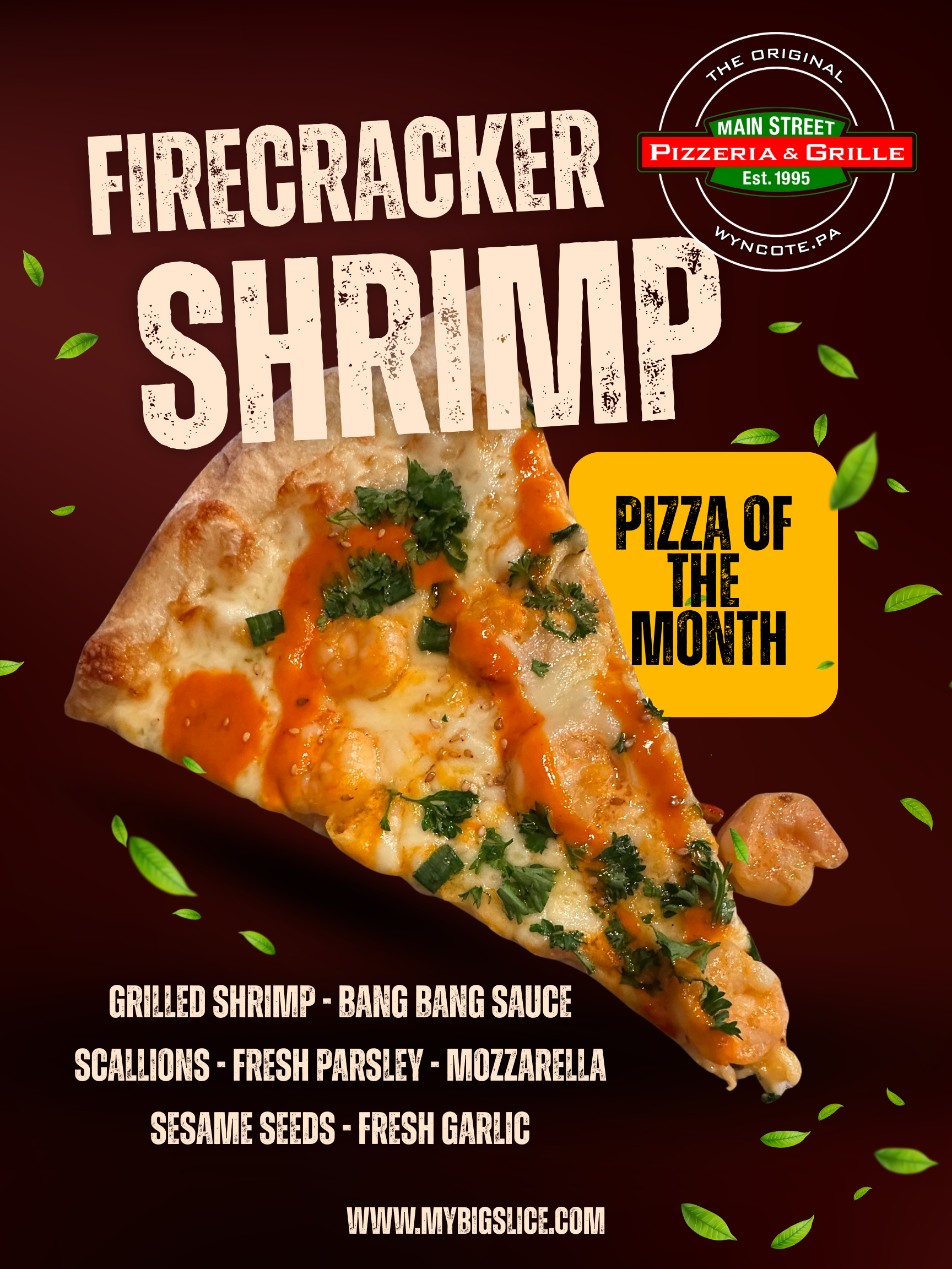 January Pizza of the Month! Grilled Shrimp - Bang Bang Sauce - Scallions - Fresh Parsley - Mozzarella - Sesame Seeds - Fresh Garlic